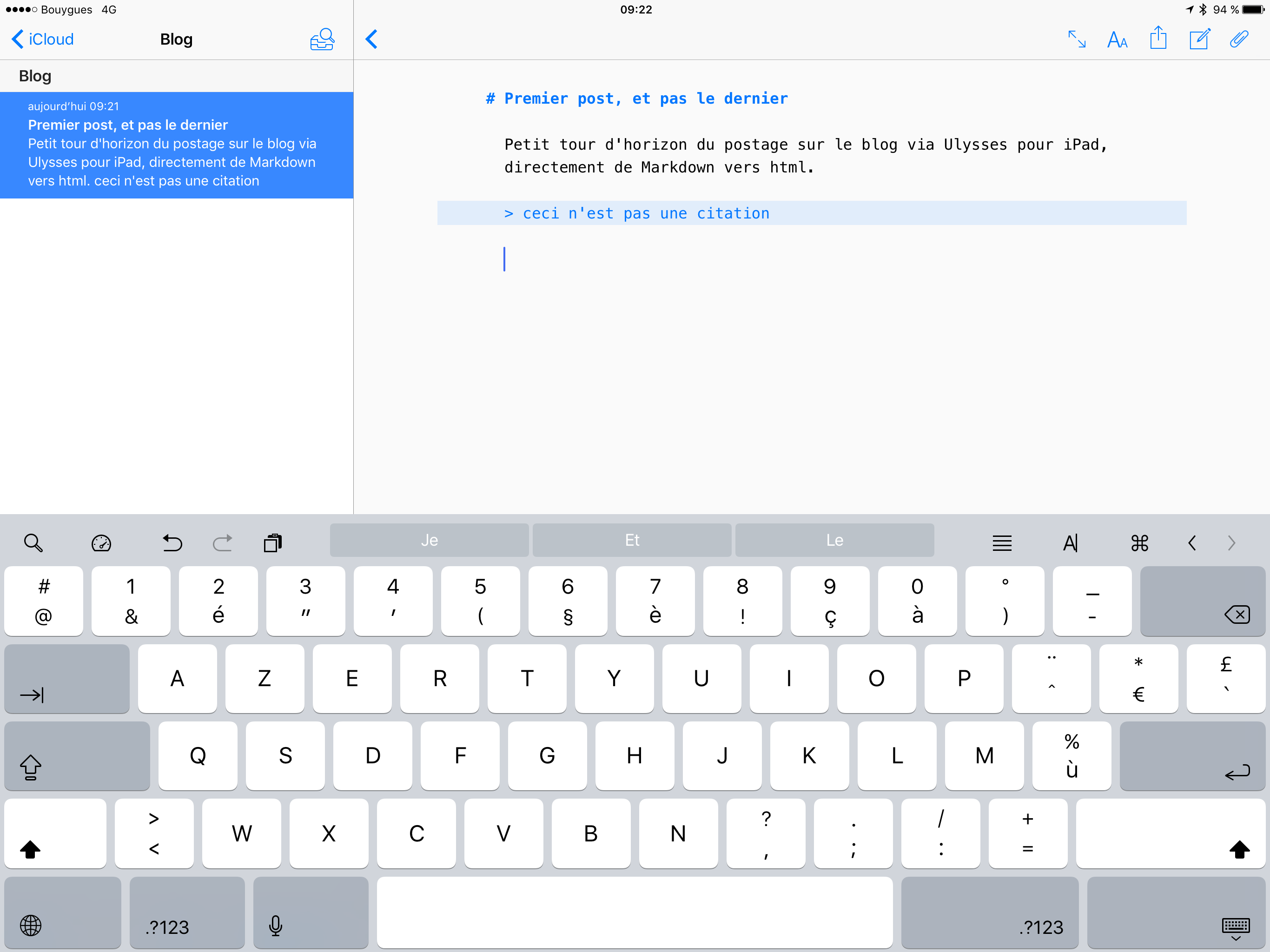 Petit tour d’horizon du postage sur le blog via Ulysses pour iPad, directement de Markdown vers html.